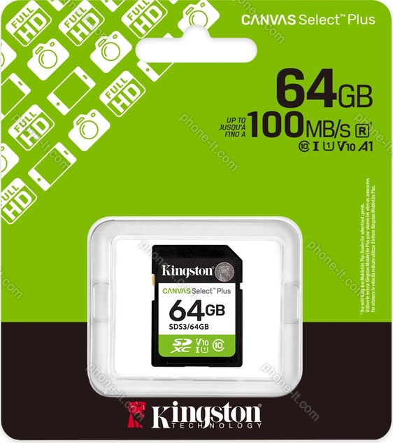 Карта памяти Kingston Canvas Select Plus Gen3 R100 SDXC 64GB, UHS-I U1, Class 10 купить недорого в Литве: гарантия качества и оптовые цены